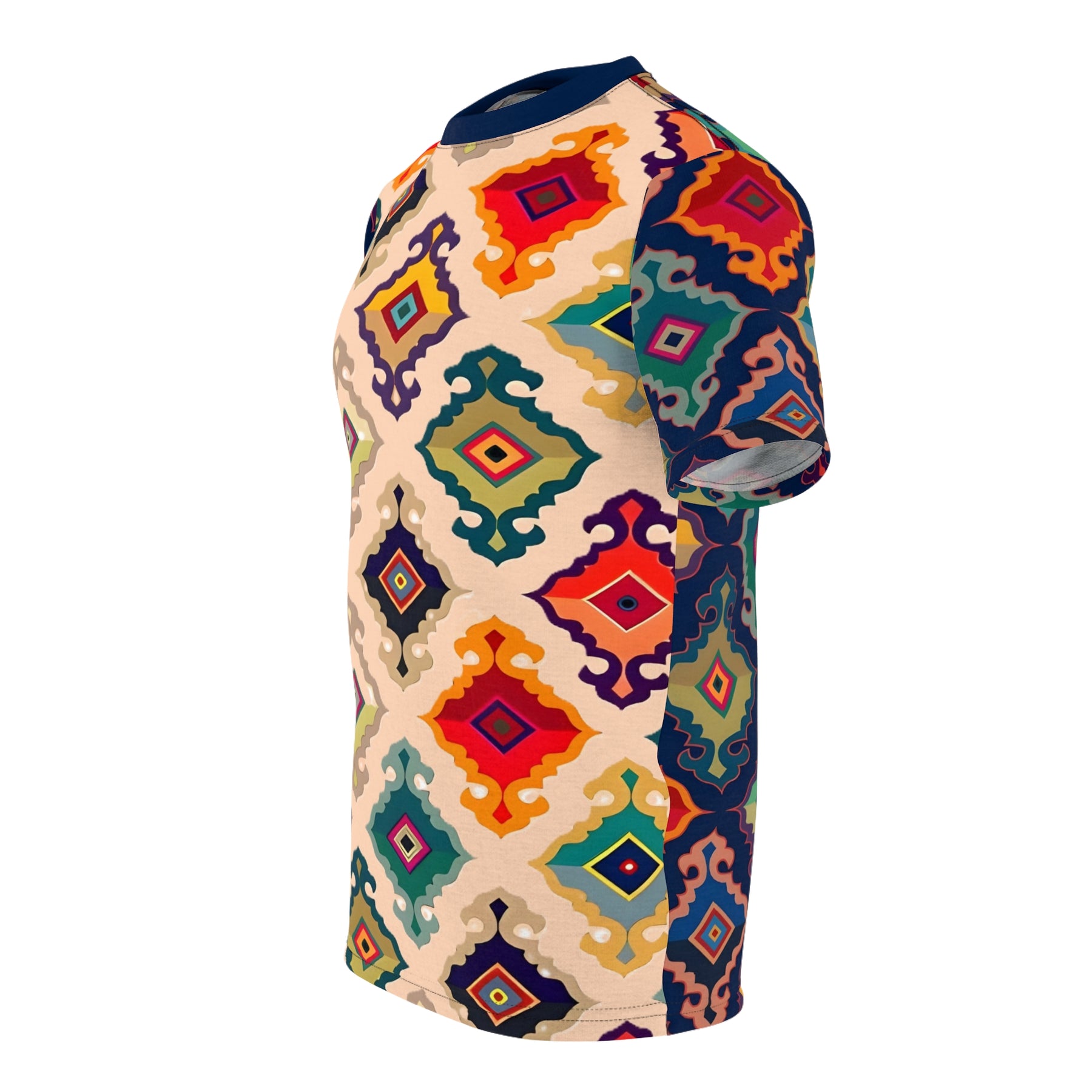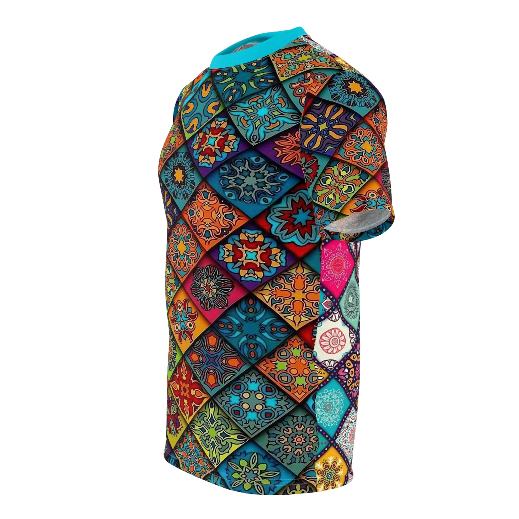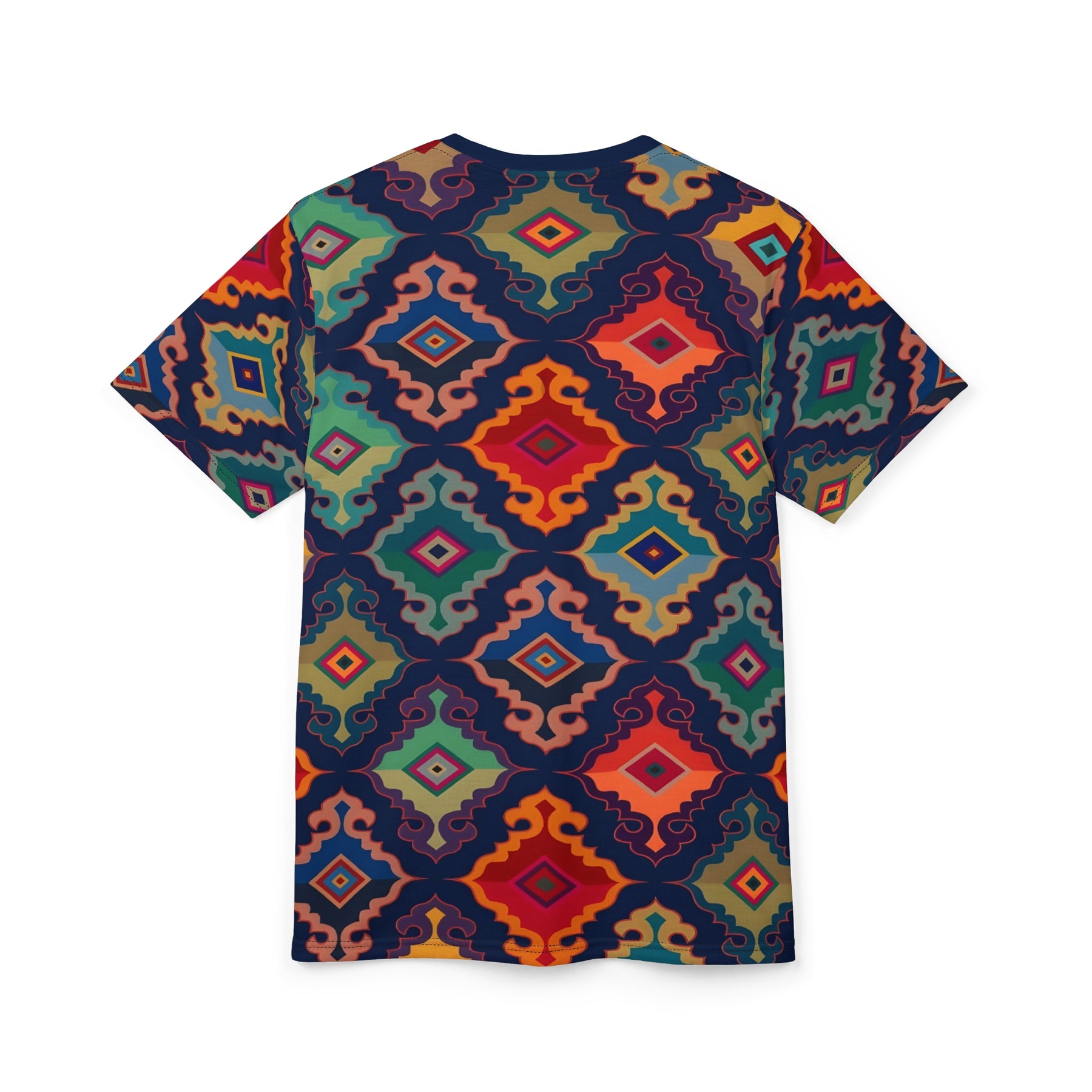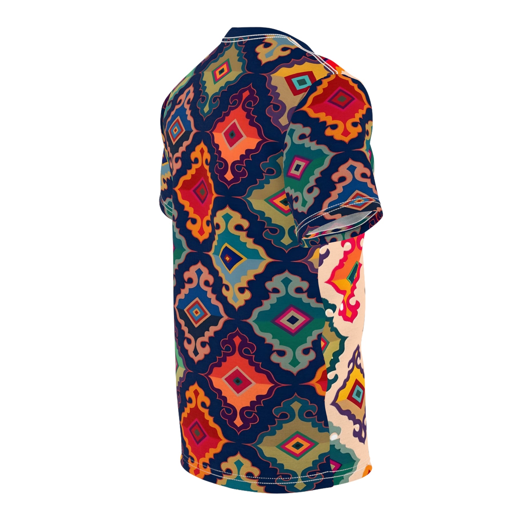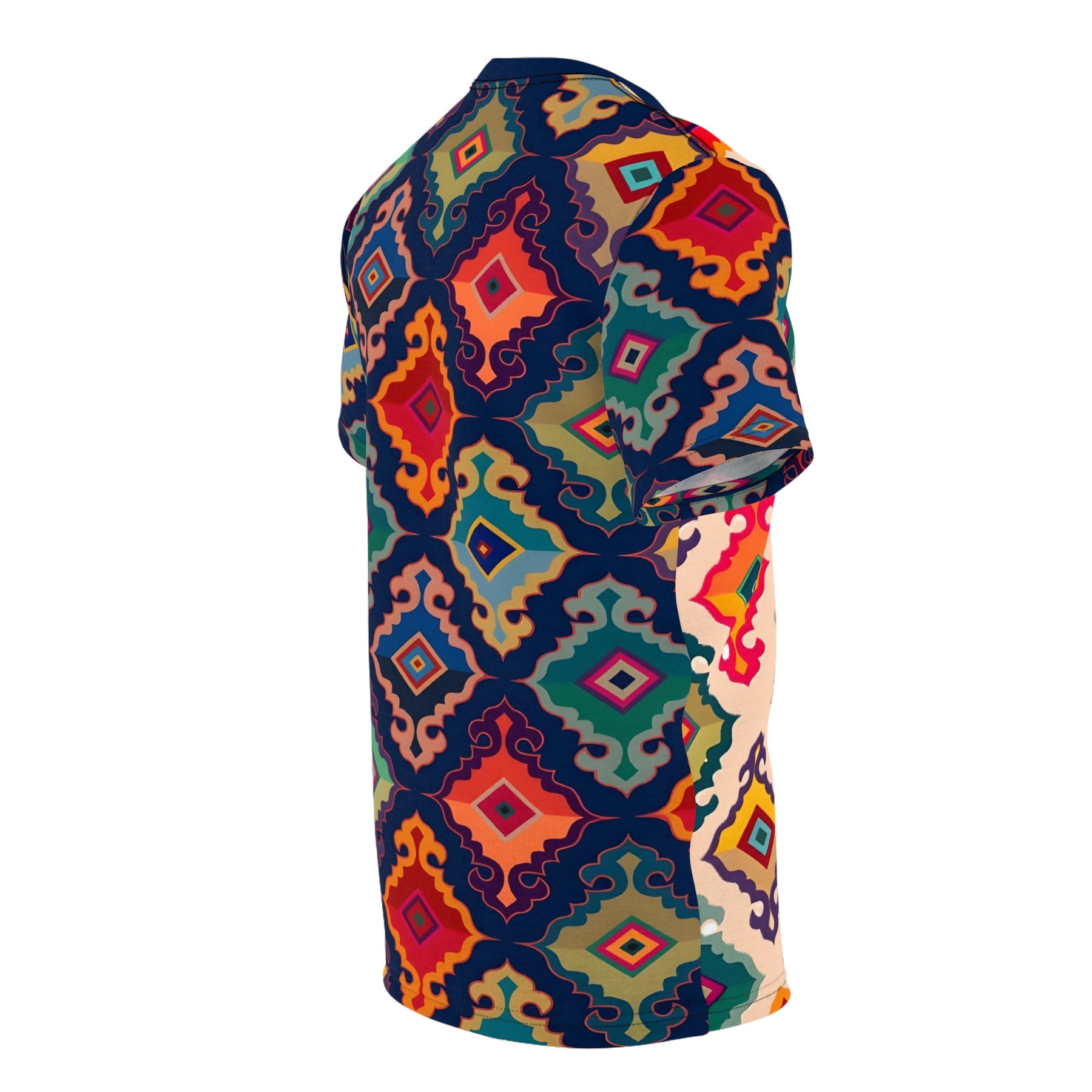Vibrant Geometric Unisex Tee, perfect for adding a pop of color and unique style to your summer wardrobe. This AOP shirt is a great gift for her and fits well into a boho fashion look. Relevant for summer celebrations and casual occasions.