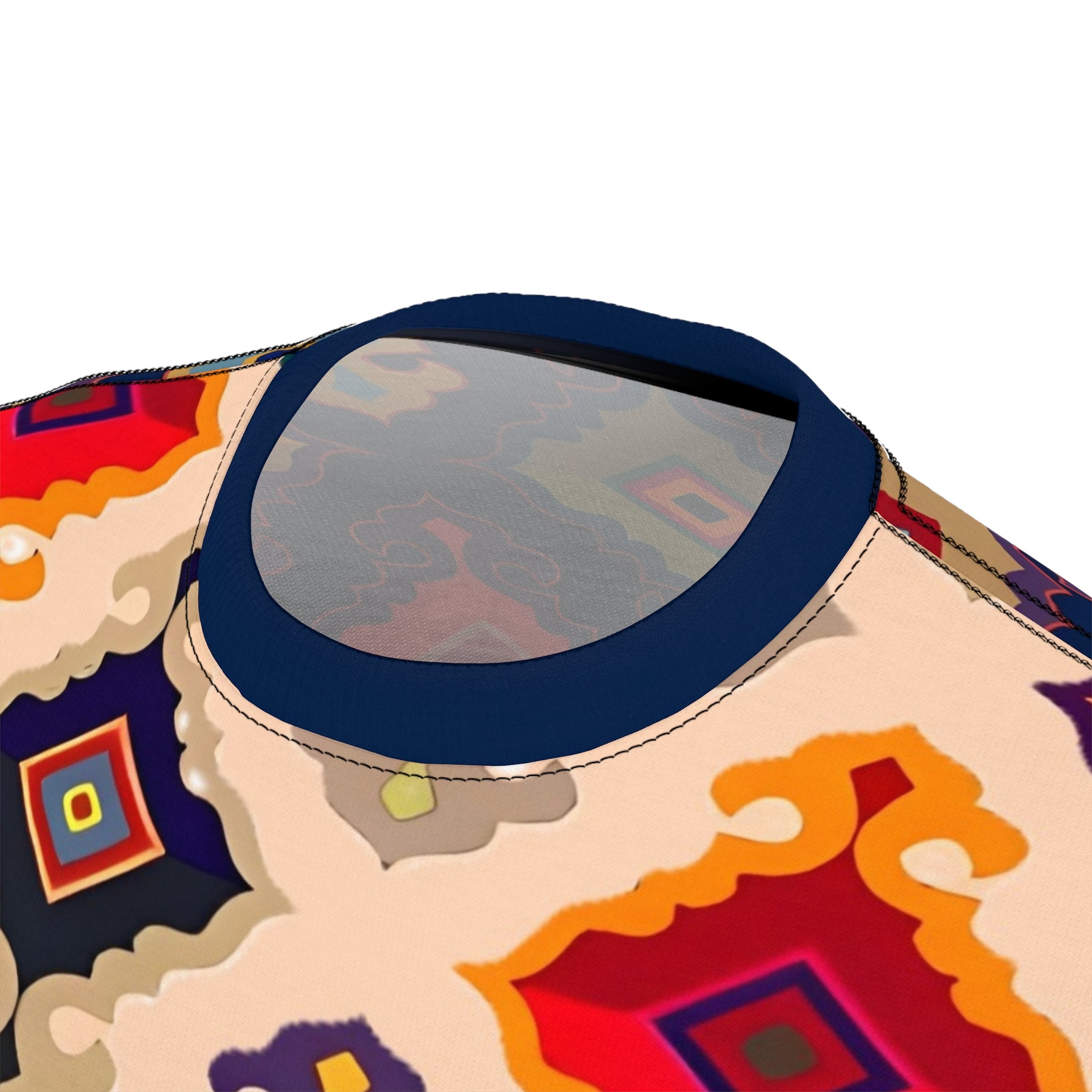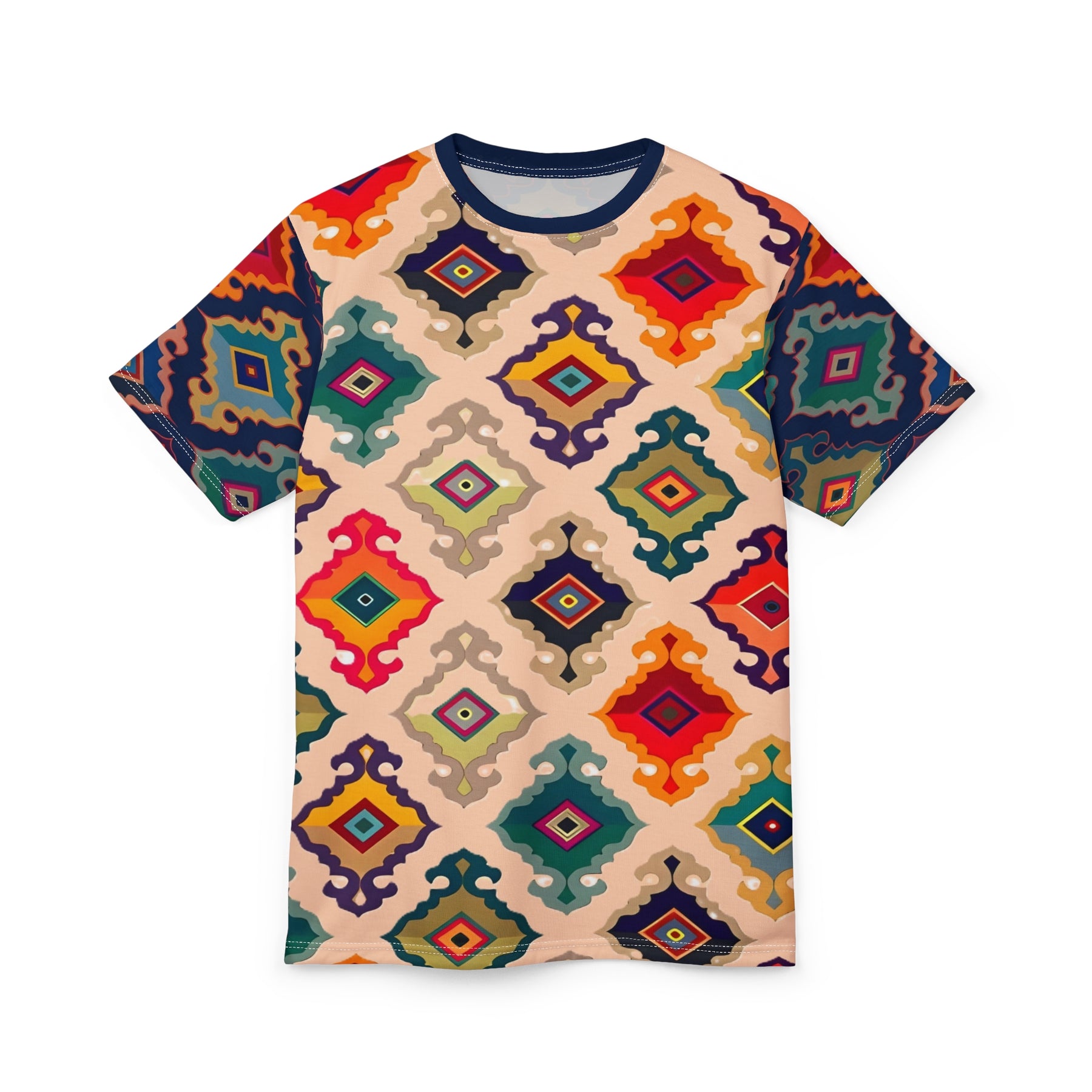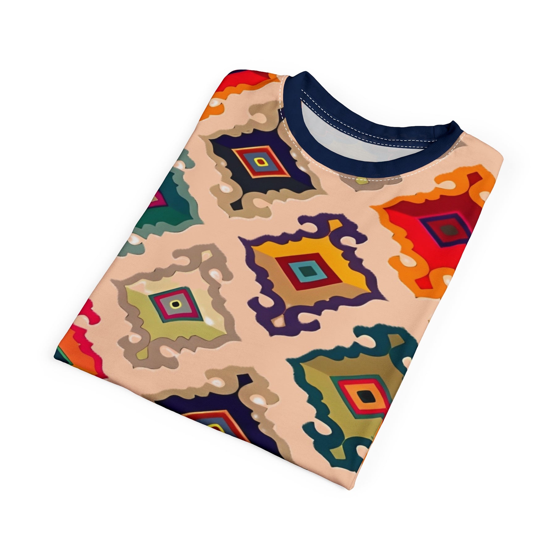Colorful geometric patterned t-shirt on a white background